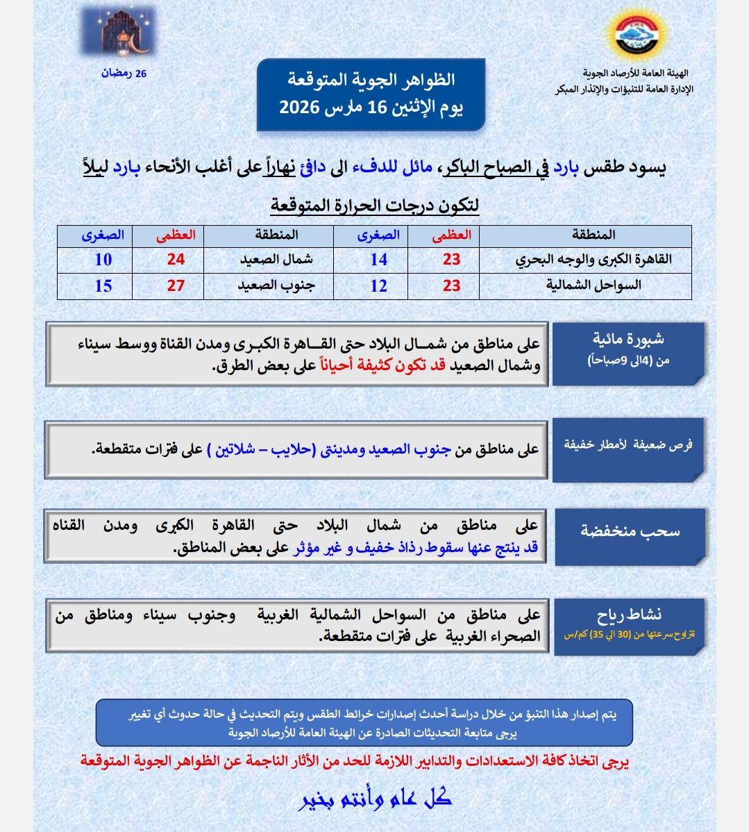تشهد حالة الطقس اليوم الإثنين في مصر 26 رمضان 2026 إالى فرص سقوط أمطار كالتالي :