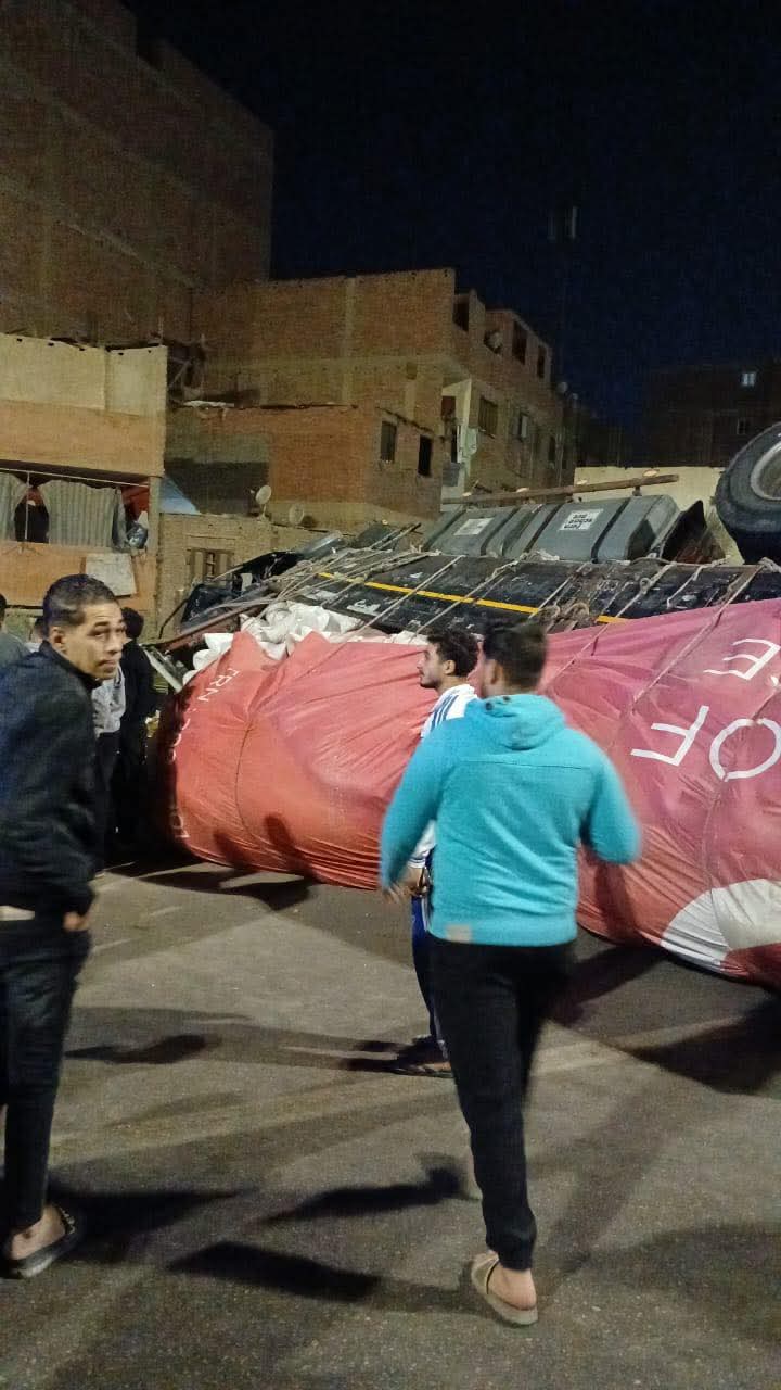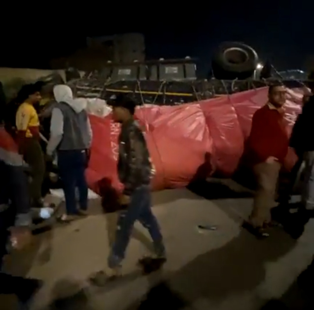 وبالفحص والمعاينة الأولية، تبين وقوع تصادم عنيف بين سيارتي نقل ثقيل وسيارة ملاكي، مما أدى إلى اختلال عجلة القيادة في يد السائقين، وأسفر الحادث عن انقلاب سيارتي النقل بحمولتهما على نهر الطريق، وتعرض السيارة الملاكي لأضرار بالغة وتهشم أجزاء كبيرة منها.