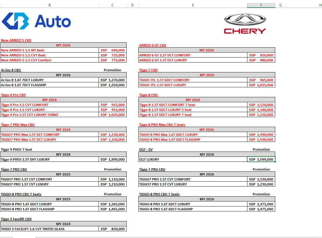 أعلنت مجموعة جي بي أوتو، وكيل علامة شيري في مصر، قائمة أسعار سيارات شيري 2026 جديدة شملت زيادة طرازات 7 طرازات دفعة واحدة للمرة الثانية خلال 10 أيام فقط.