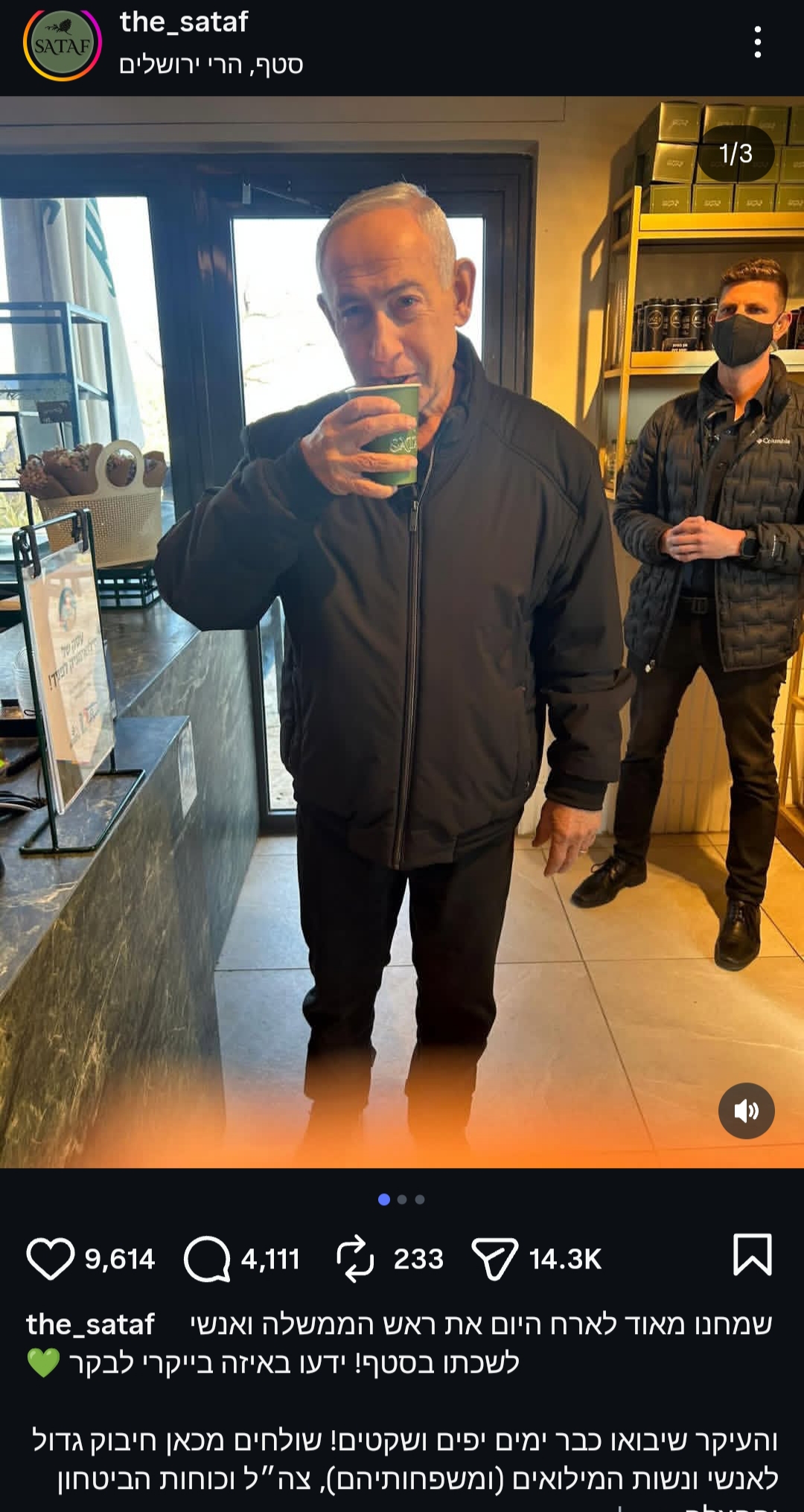 نشر حساب مقهى "the sataf" الذي ظهر فيه نتنياهو أثناء الفيديو، صورًا توثق تواجد رئيس الوزراء الإسرائيلي بنيامين نتنياهو وموظفي مكتبه.