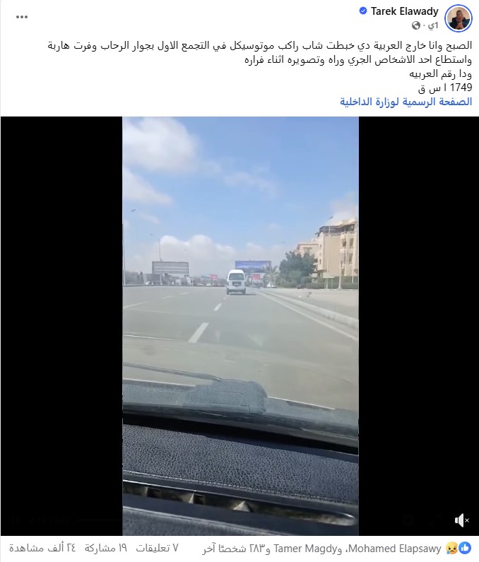 كشفت الأجهزة الأمنية بوزارة الداخلية، ملابسات مقطع فيديو نشره المحامي طارق العوضي على مواقع التواصل الاجتماعي، تضمن اصطدام سيارة "فان" بدراجة نارية وإصابة قائدها بالقاهرة الجديدة، وهروب سائق السيارة من مكان الحادث.