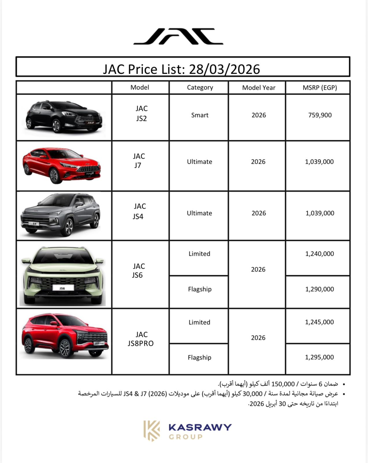 وشملت قائمة الأسعار تثبيت سعر طرازي جاك JS2 و JS6، وارتفع سعر طرازي J7، وJS4 بقيمة 41 ألف جنيه، كما زاد سعر الفئة الثانية من طراز جاك JS8 Pro بقيمة 20 ألف جنيه.