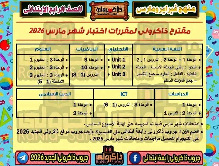 مقرر شهر مارس للصف الرابع الابتدائي 2026
