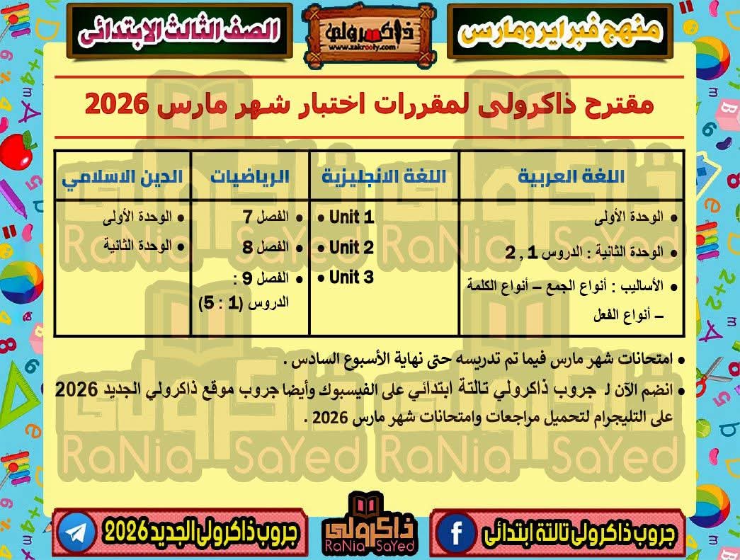 وأعلنت الإدارات التعليمية بالمحافظات مقررات شهر مارس للصف الثالث الابتدائي والتي جاءت كالتالي: