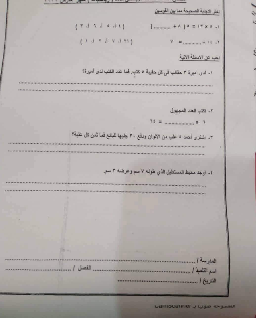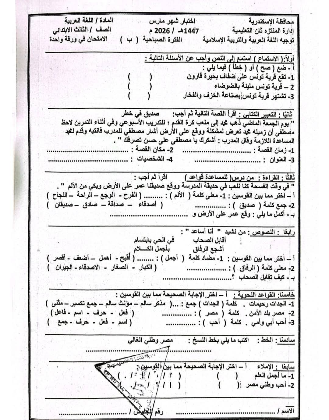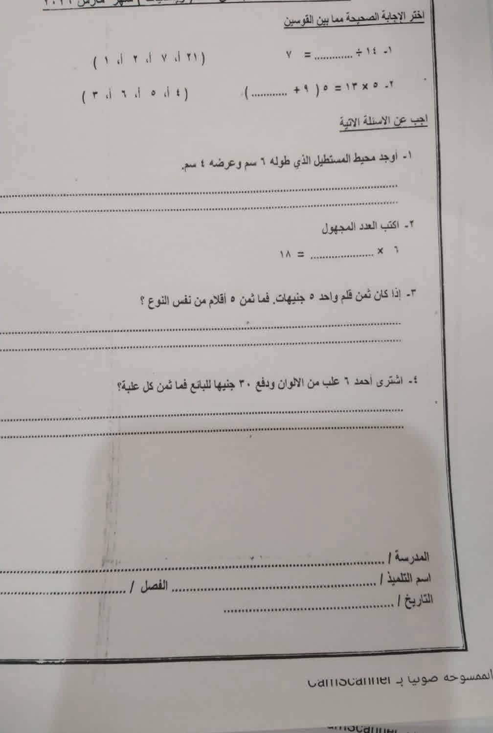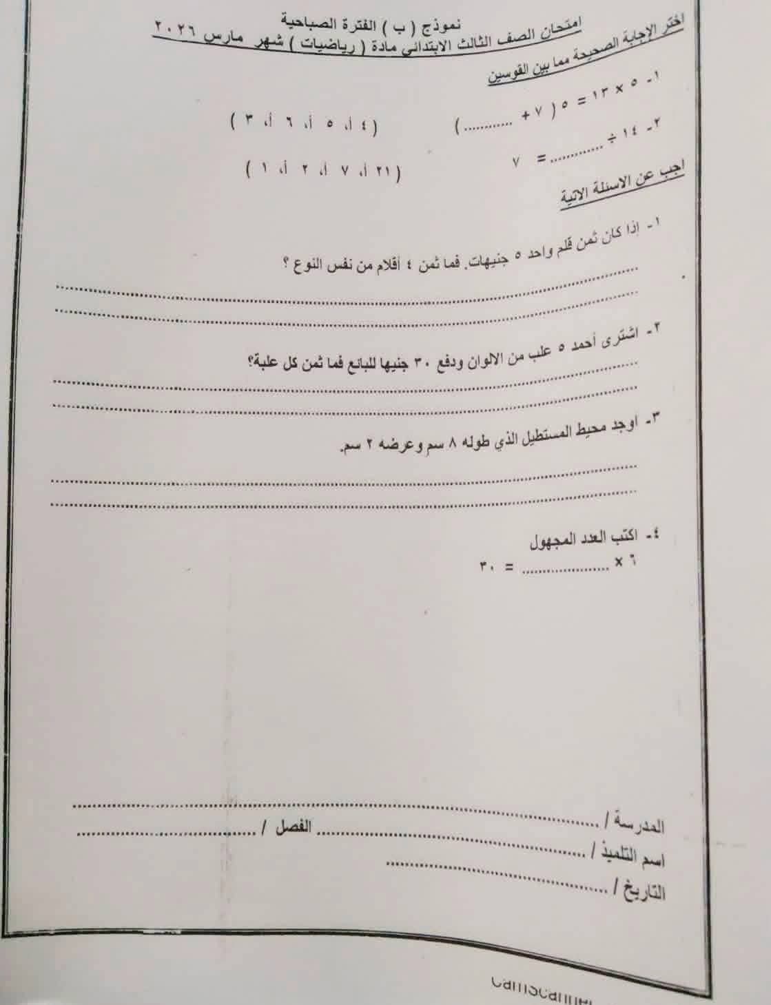 نماذج امتحانات شهر مارس للصف الثالث الابتدائي جميع المواد