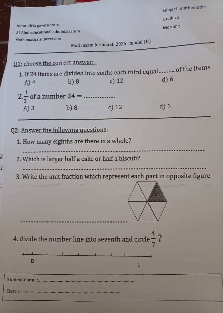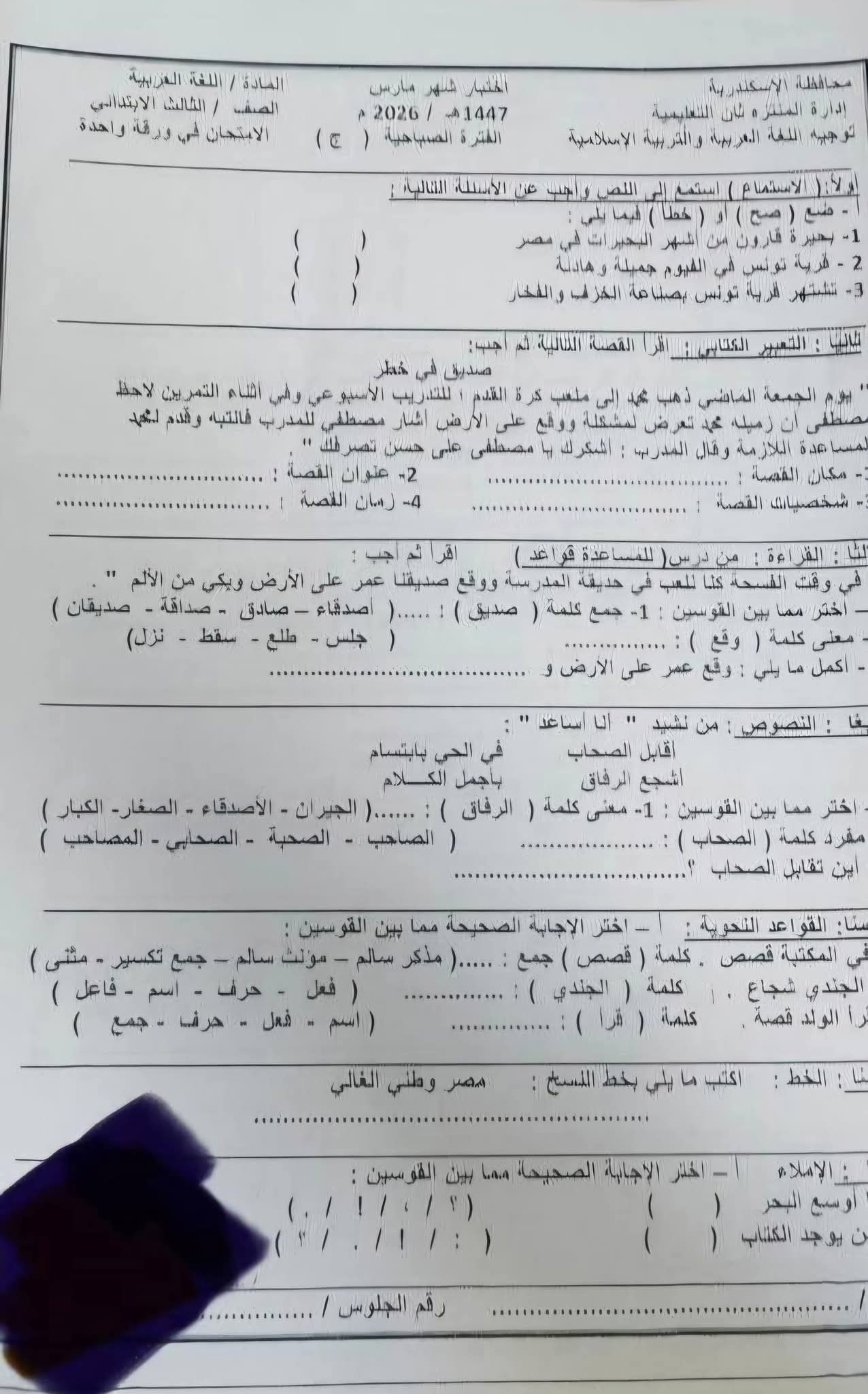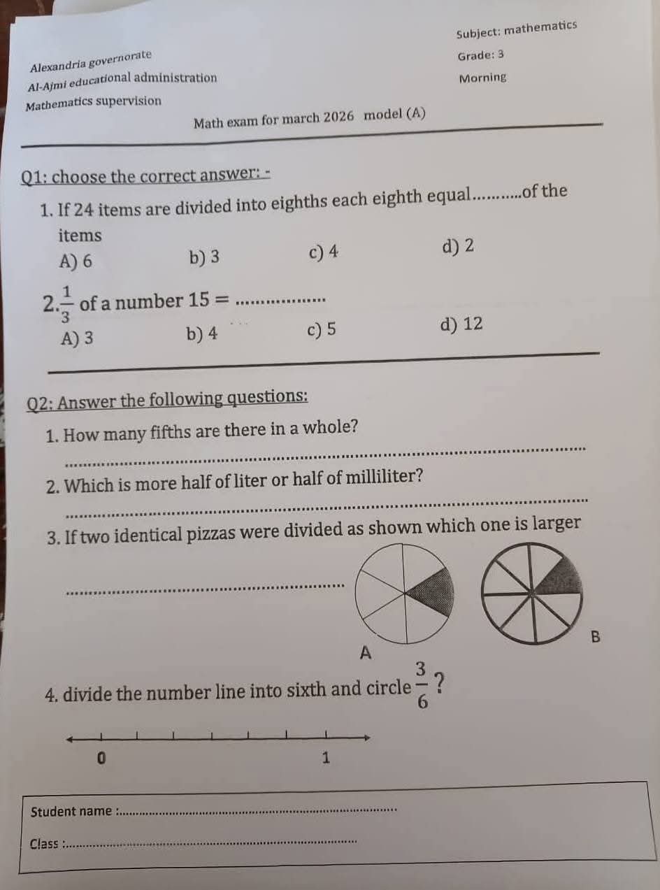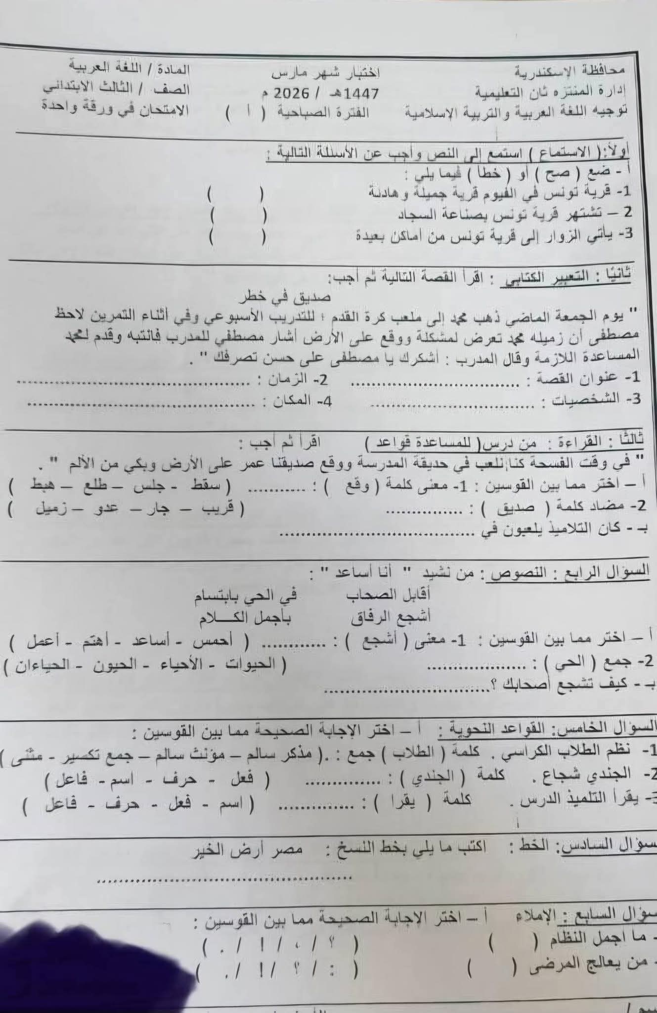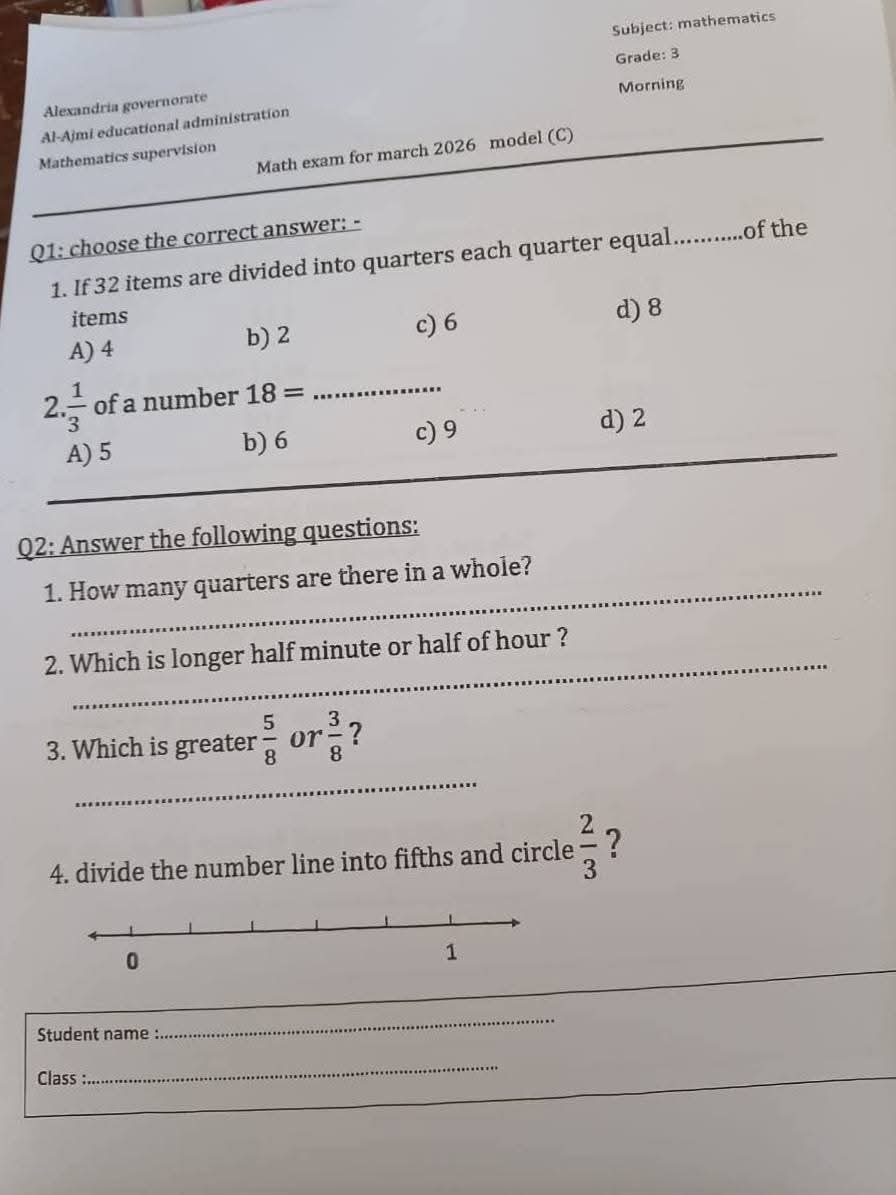 نماذج امتحانات شهر مارس للصف الثالث الابتدائي جميع المواد