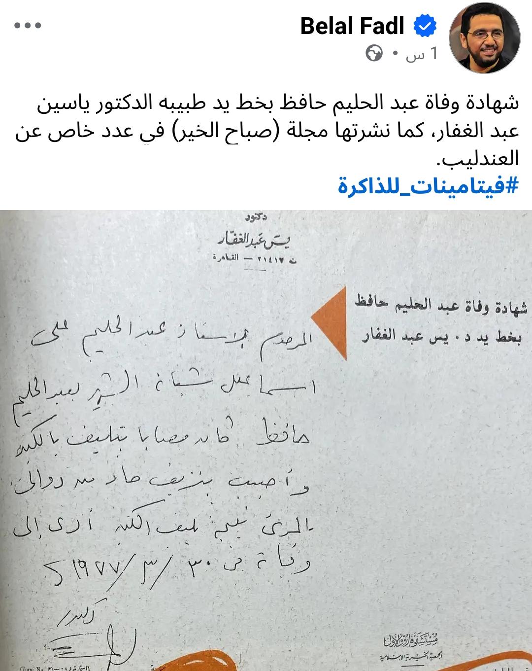 في ذكرى وفاة الفنان عبد الحليم حافظ، التي توافق يوم 30 مارس، نشر الكاتب بلال فضل صورة نادرة لشهادة وفاة العندليب الأسمر عبر صفحته على موقع "فيسبوك"وهي الشهادة التي كُتبت بخط يد الدكتور ياسين عبد الغفار، الطبيب الخاص للفنان الراحل، وجاءت ضمن عدد خاص من مجلة “صباح الخير” الذي وثّق اللحظات الأخيرة في حياة العندليب.