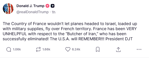 وفي منشور منفصل، وجّه ترامب انتقادات مباشرة إلى فرنسا، متهمًا إياها بعدم التعاون بالشكل الكافي خلال العمليات العسكرية.