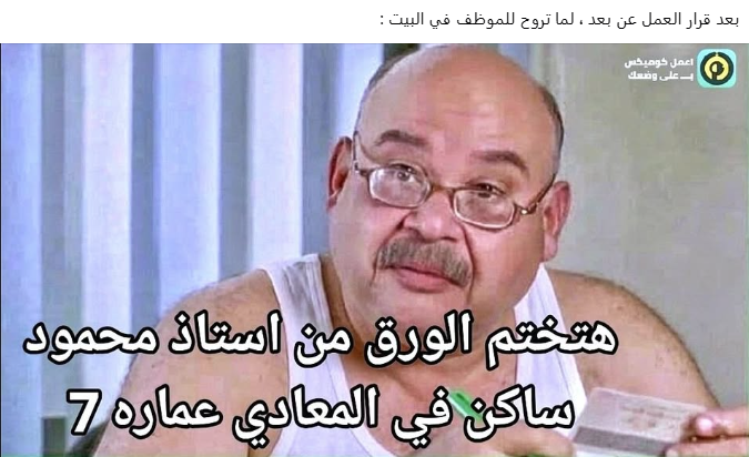 أطلق العديد من الموظفين بالقطاعين العام والخاص عدد كبير من الكوميكس والميمز كنوع من التفاعل مع قرار العمل عن بُعد يوم الأحد من كل أسبوع قبل ساعات من تطبيقه في مصر، ما عكس حالة من التباين ما بين سعادتهم بالقرار وسخريتهم من التحديات التي ستواجههم من العمل المنزلي.