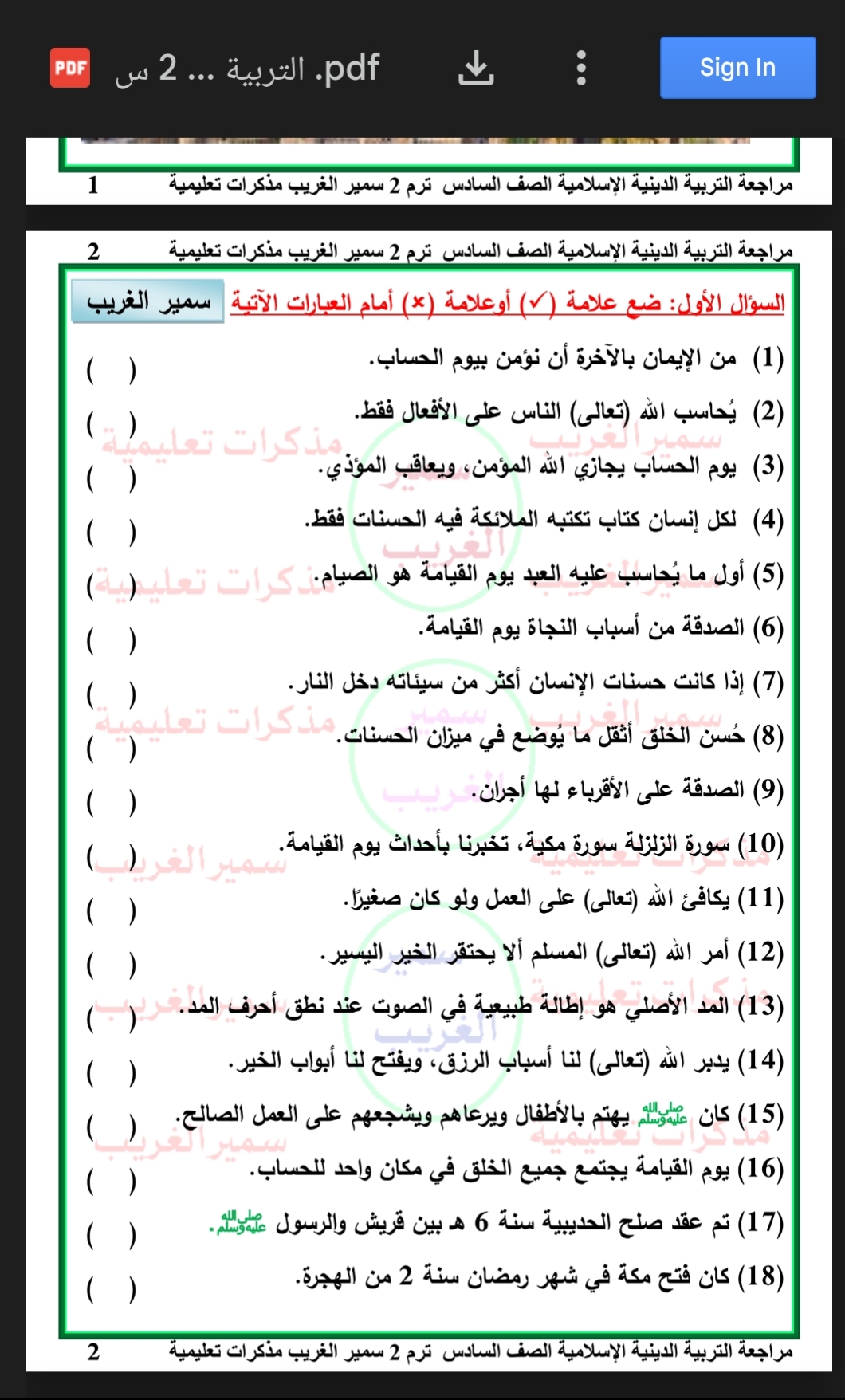 تحميل ملزمة دين أسئلة وإجابات للصف السادس الابتدائي الترم الثاني pdf