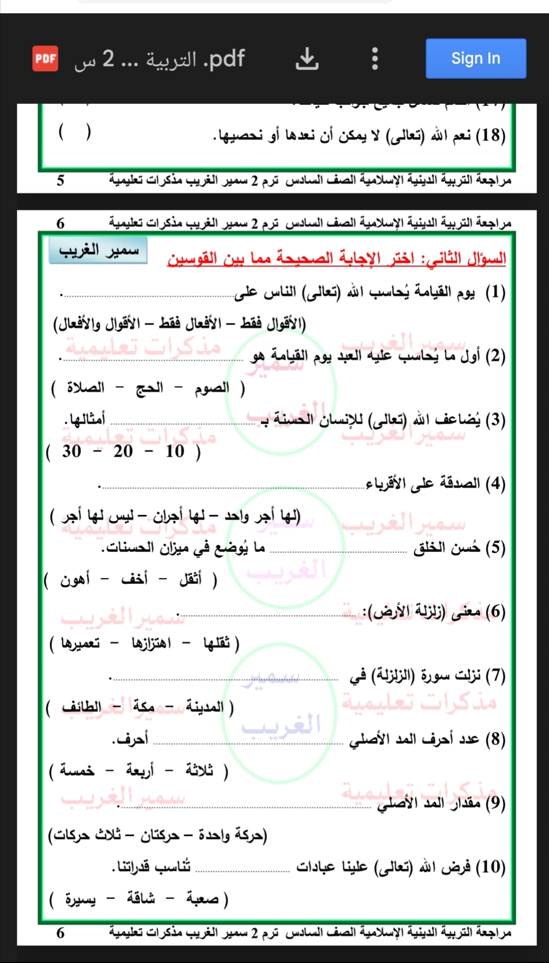 ملزمة دين الصف السادس الابتدائي الترم الثاني pdf 2026