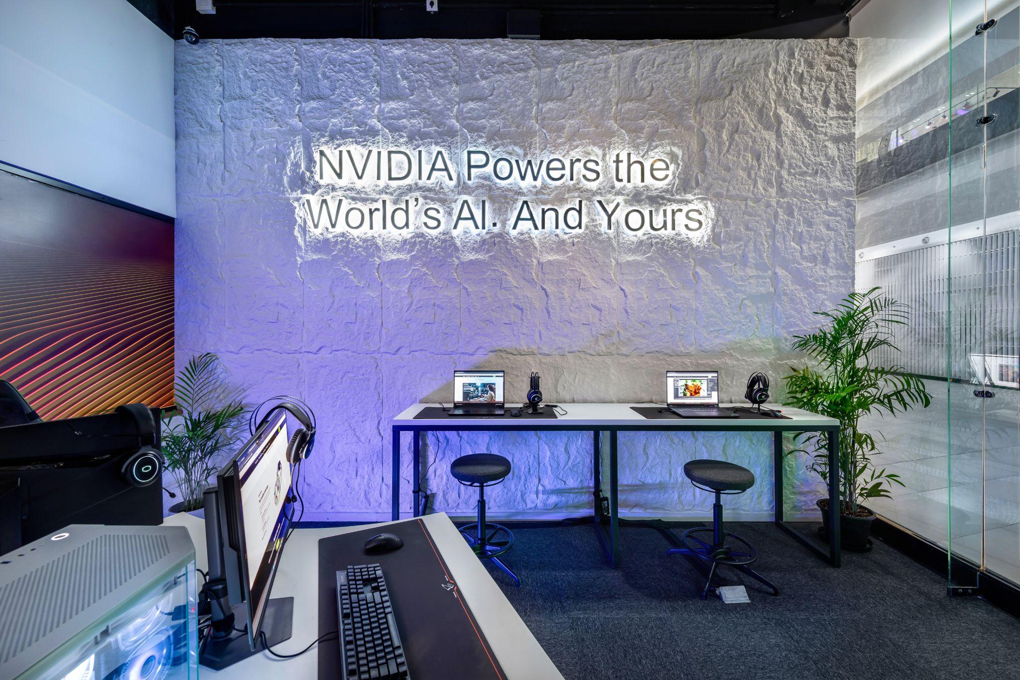 يتوافر داخل المساحة مجموعة من أجهزة اللاب توب وسطح المكتب التي تعمل ببطاقات سلسلة NVIDIA GeForce RTX 50، والتي تأتي من شركاء NVIDIA مثل ASUS وMSI وZotac وGigabyte وRazer.