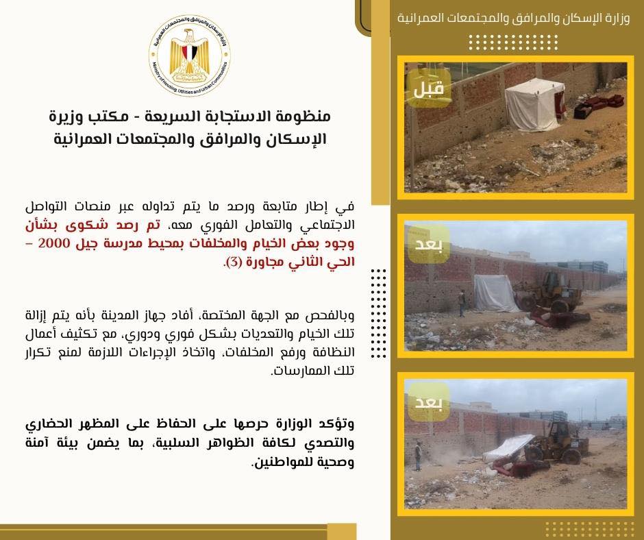 أعلنت منظومة الاستجابة السريعة بمكتب وزيرة الإسكان والمرافق والمجتمعات العمرانية، تعاملها الفوري مع شكاوى تم رصدها عبر منصات التواصل الاجتماعي، بشأن وجود خيام ومخلفات بمحيط مدرسة جيل 2000 بالحي الثاني، مجاورة (3).