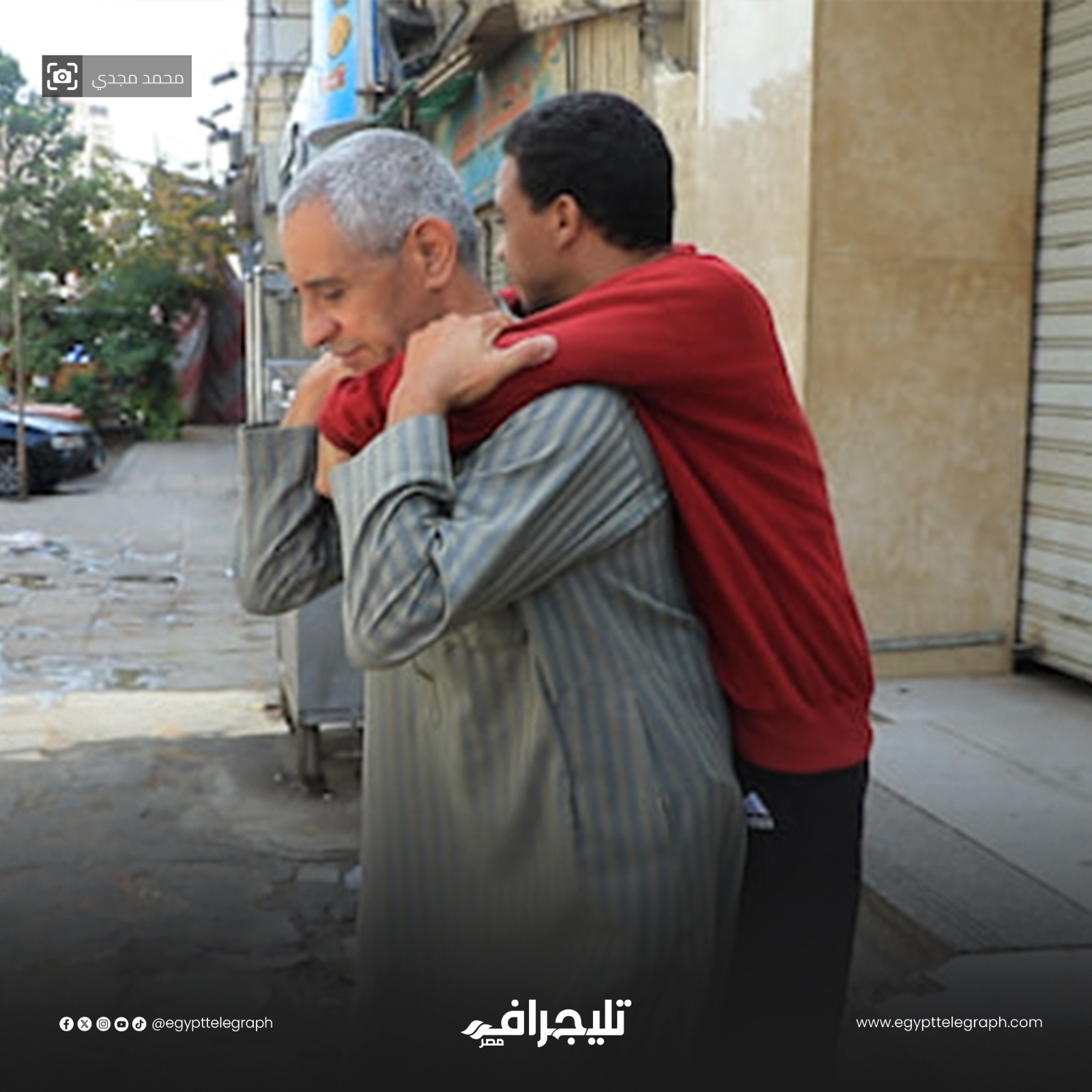 يحمل الأب المسن ابنه محمد على ظهره من حلوان إلى العباسية لجلسات العلاج الطبيعي، يدعو الله أن يجد وسيلة مواصلات ترضى أن تقله مع نجله، لأنه من الصعب أن يجد سائق يوافق على توصيله -حسبما وصف- ولكن أحيانًا يقف له أُناس لن يعرفها من أجل مساعدته.