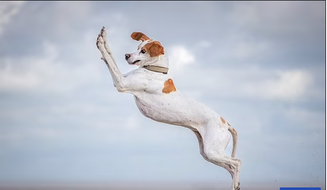“فيرا فاوبل”، كلب يحلق في الهواء وعلى وجهه نظرة مرحة.