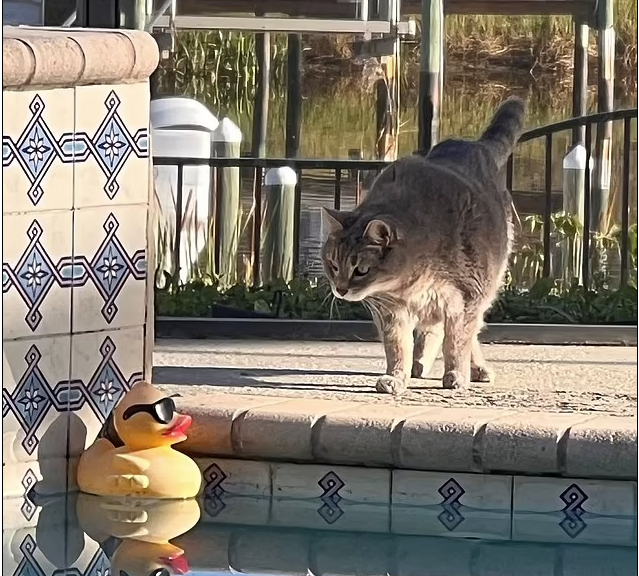 قطة تنظر باهتمام إلى بطة مطاطية ترتدي نظارة شمسية وتنعكس في الماء