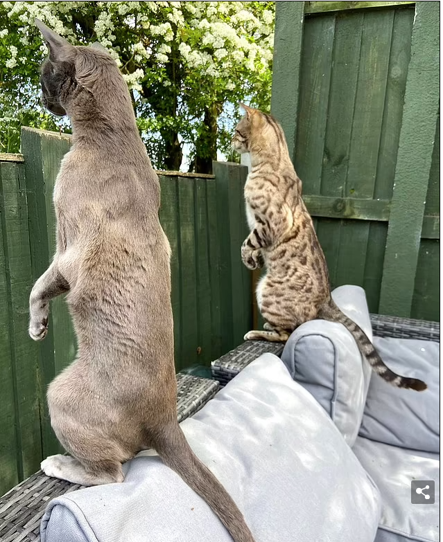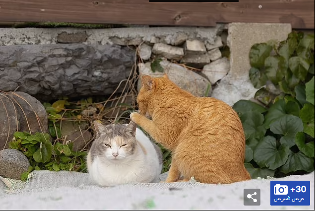 الجيران الفضوليون، قطتان تراقبان ما يدور في الشارع، بينما تضعان رؤوسهما فوق السياج.