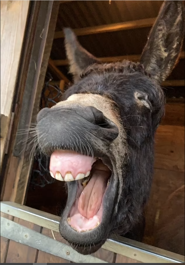 حمار متعب يتثاءب بشدة، فيبدو وكأنه يبتسم