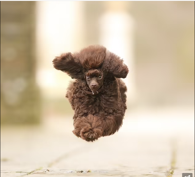 كلب بودل رقيق يكسو وجهه شعر كثيف، يقفز مرتفعًا في نظرة ترقب كما لو كان يطارد شيئًا ما.