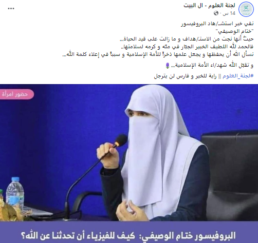 وكتبت صفحة على فيسبوك تحمل اسم “لجنة العلوم-ال البيت”، "نفي خبر استشــهاد البروفيسور ختام الوصيفي، حيثُ أنها نجت من الاستـهداف وما زالت على قيد الحياة، فالحمد للّٰه اللطيف الخبير الجبّار في منّه وكرمه لسلامتها، نسأل الله أن يحفظها و يجعل علمها ذخراً للأمة الإسلامية و سبباً في إعلاء كلمة اللّٰه".